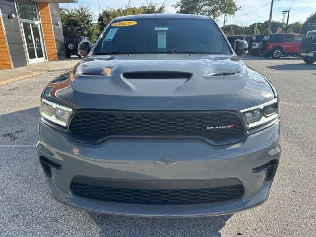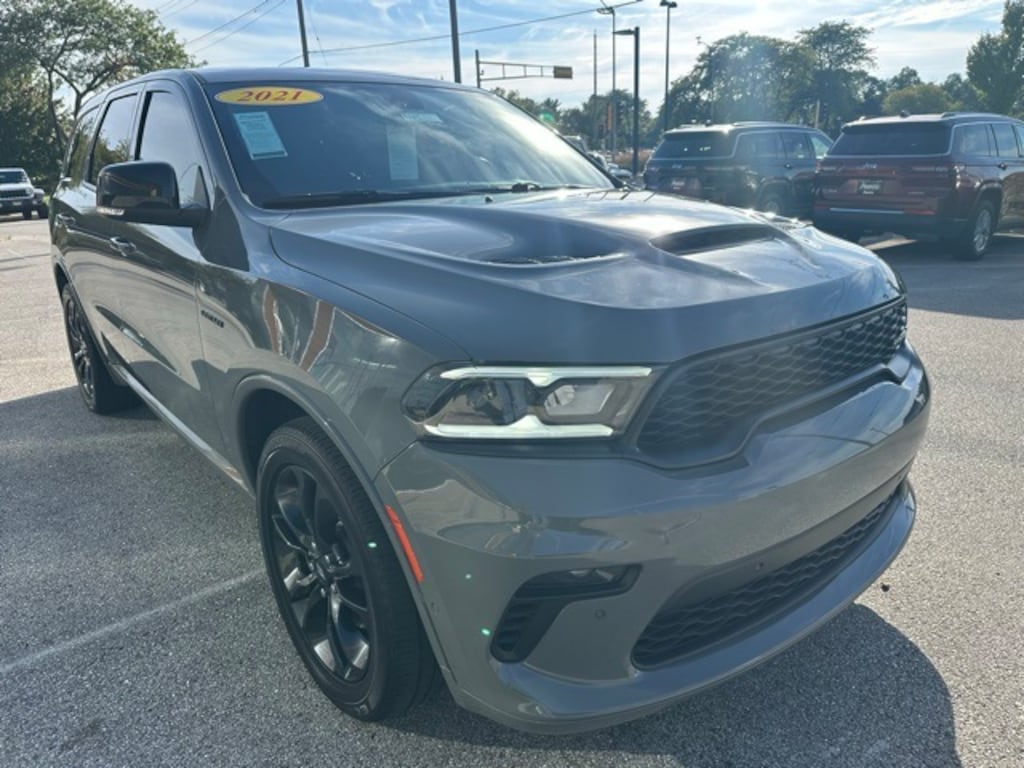 The 2021 Dodge Durango R/T AWD brings muscle, style, and utility together in a commanding three-row SUV. Finished in Destroyer Gray Clearcoat with a bold Red/Black interior, it sports aggressive lines, a Blacktop Package with gloss black accents, and striking 20-inch Black Noise aluminum wheels. LED lighting, a power liftgate, and a sporty stance give the Durango R/T the perfect balance of utility and attitude.