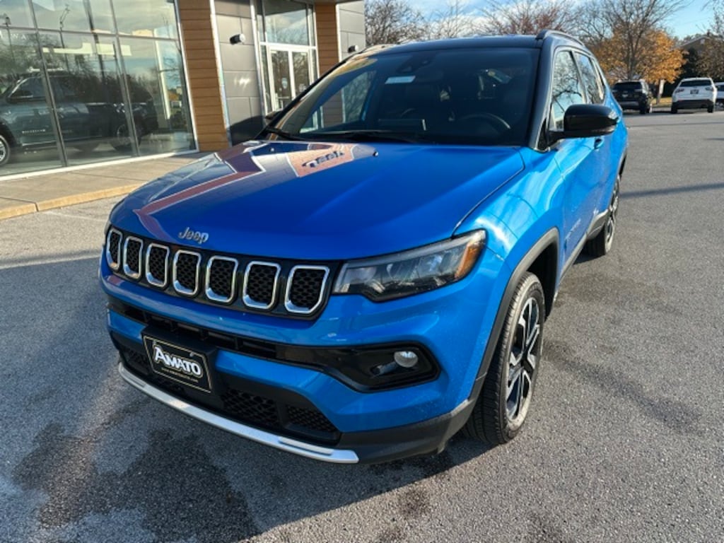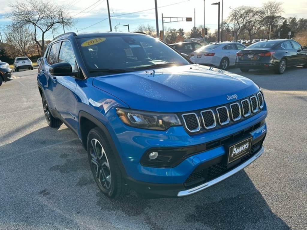 The 2023 Jeep Compass Limited 4x4 stands out boldly in Laser Blue Pearlcoat, giving the SUV a modern and sporty presence on the road. Its exterior combines premium touches like chrome window trim, a refined black/chrome grille, and sleek body-colored bumpers with practical elements such as rain-detecting wipers, heated mirrors, LED cornering lights, and a dual hidden exhaust. Deep-tinted glass, roof rack rails, and a subtle rear lip spoiler round out a look that balances rugged capability with upscale sophistication.