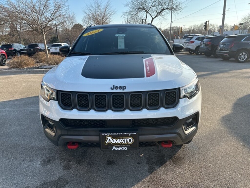 This 2024 Jeep Compass Trailhawk 4x4 is finished in Bright White Clearcoat with a Ruby Red and Black interior, combining rugged Trailhawk capability with modern technology and comfort. Its powered by a 2.0L turbocharged four-cylinder engine paired with an 8-speed automatic transmission and an advanced four-wheel-drive system, delivering confident performance both on-road and off-road. Trailhawk-specific equipment includes an off-road-tuned suspension, skid plates, hill descent control, hill hold control, electronic transfer case, and a 4.398 final drive ratio, making it well-prepared for challenging terrain.