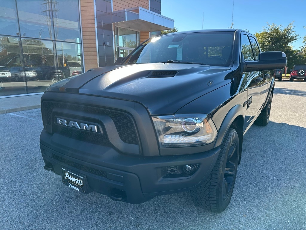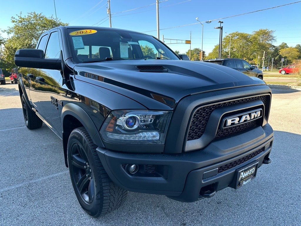 The 2022 Ram 1500 Classic Warlock 4x4 Quad Cab commands attention with its rugged styling and bold Diamond Black Crystal Pearlcoat exterior. Featuring 20-inch semi-gloss black aluminum wheels, black powder-coated bumpers, and MOPAR Sport Performance Hood, this truck delivers an unmistakable road presence. The Warlock Package enhances its tough character with black badging, raised ride height, tow hooks, and wheel flares, while LED fog lamps, projector headlamps, and deep-tinted glass round out its aggressive look.